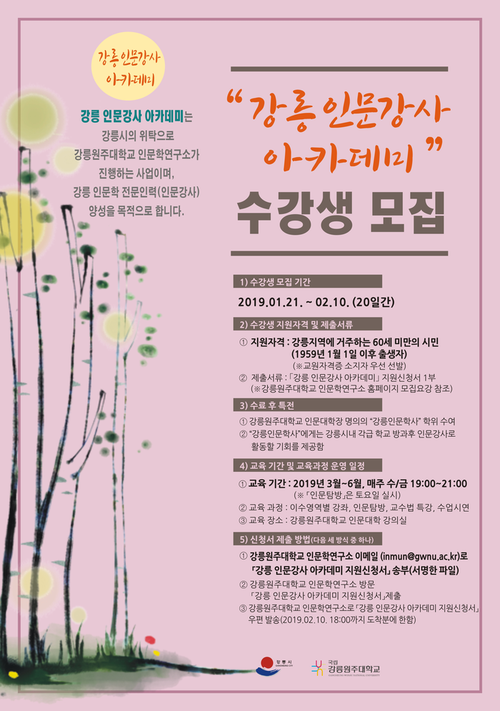 - 강원대학교 인문학연구소로 「강릉 인문강사 아카데미 지원신청서」 우편 발송(2019.02.10. 18:00까지 도착분에 한함)